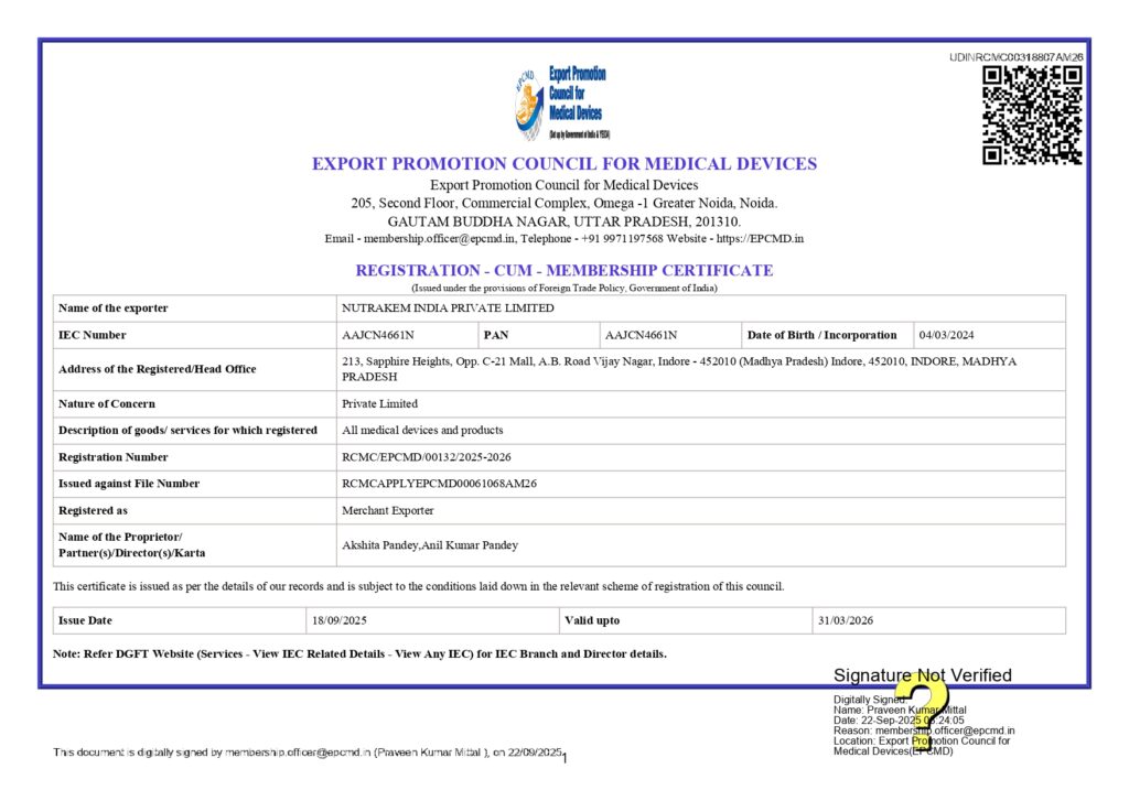 Export Promotion Council for Medical Devices- Membership Certificate
